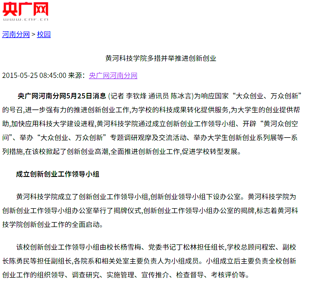 黄河科技学院成立了创新创业工作领导小组,创新创业领导小组下设办公室。黄河科技学院为创新创业工作领导小组办公室举行了揭牌仪式,创新创业工作领导小组办公室的揭牌,标志着黄河科技学院创新创业工作的全面启动。