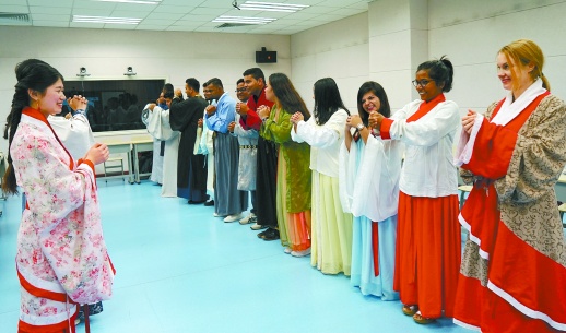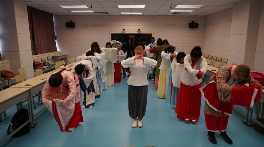 图为新西兰凯特学院的师生学习中华传统礼仪。