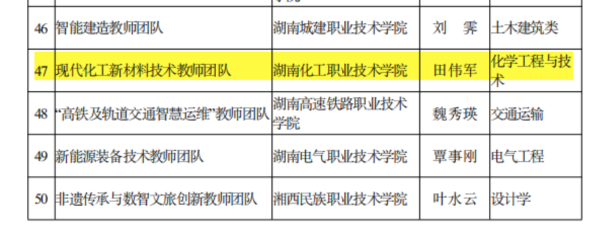 近日,湖南省教育厅公布首批“湖南省高校黄大年式教师团队”认定结果,我院现代化工新材料技术教师团队凭借突出的教学成果、强劲的科研实力和深厚的育人情怀成功入选,成为全省获此殊荣的团队之一。