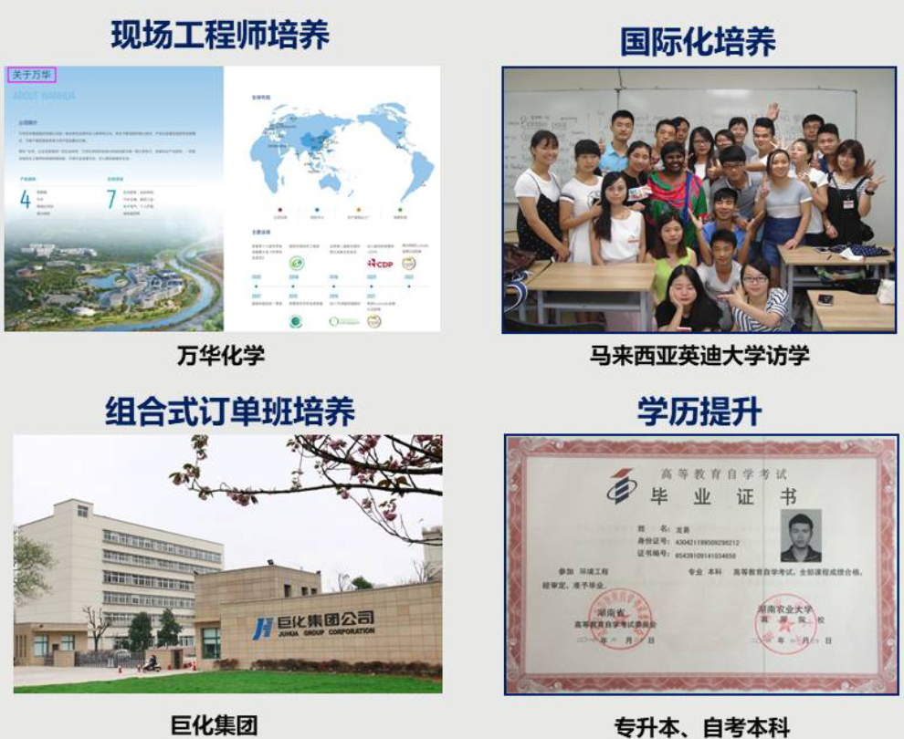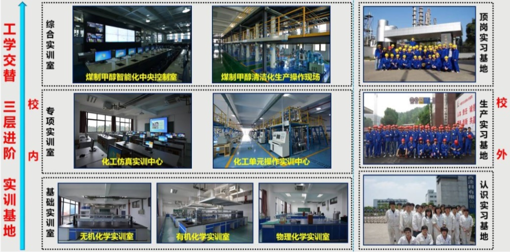 工学交替、三层进阶:对接国际技术标准和企业生产现场,打造包含基础实训室、专项实训室和综合实训室的国内一流、国际领先的三层次综合实训体系,成为校内师生、兴隆化工等企业职工和中南大学等本科院校学生技能提升的重要阵地;同时在中石化湖南石化、湘江关西等国际知名企业开拓校外认识实习、生产实习和顶岗实习基地,为工学交替、三层进阶的人才培养模式提供保障。