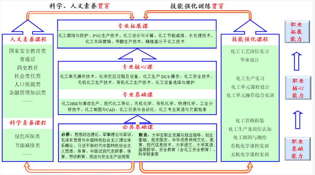 对接化工生产现场操作等职业岗位、化工总控工等职业资格证书、化工精馏操控职业技能等级证书标准以及全国职业院校技能大赛化工生产技术赛项和世界技能竞赛水处理赛项要求,紧密围绕培养能从事化工现场操作和中控操作等岗位工作的复合型技术技能人才的目标要求,遵循职业基础、核心和拓展能力“三递进”规律,践行科学、人文素养和技能强化训练“两贯穿”的 “三层两贯穿”的应用化工技术专业课程体系。
