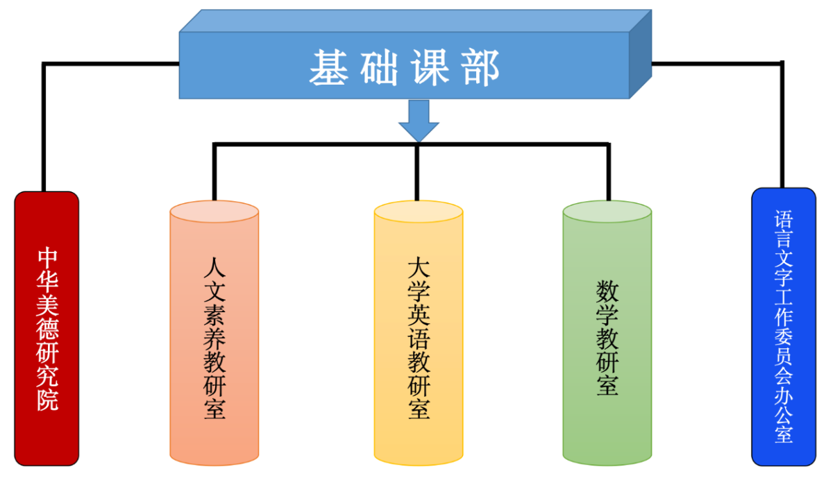 目前,基础课部设有三个教研室,分别为人文素质教研室、大学英语教研室、数学教研室,主要负责《演讲与写作》《中华优秀传统文化》《礼仪与交流》《大学英语》《高等数学》等多门公共课程建设、教育教学改革、科研建设、师资队伍建设等工作,三个教研室都曾被评为学校优秀教研室。同时,中华美德研究院和语言文字工作委员会办公室均挂靠在基础课部。