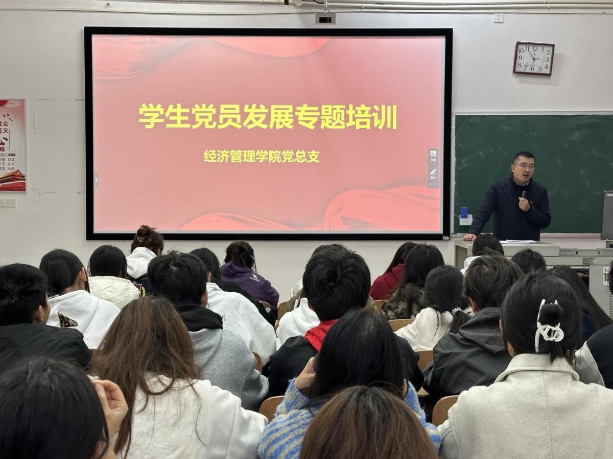 为切实提高学生党员发展质量,严把党员“入口关”,10月21日,经济管理学院党总支在励志楼420教室组织开展了学生党员发展专题培训。本次培训由学院党总支书记杨孝辉同志主讲,全体入党申请人参加。