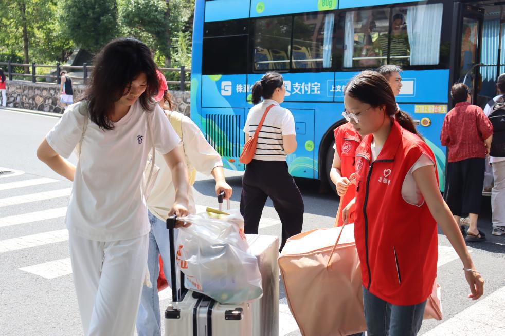 校内外迎新团队工作有序,校内摆渡车穿梭于校门与宿舍区,平稳运送新生及行囊。各专业代班迅速投入工作,引导新生完成注册、核对证件,流程衔接高效。校外志愿者在株洲市汽车中心站坚守岗位,圆满完成接新任务。