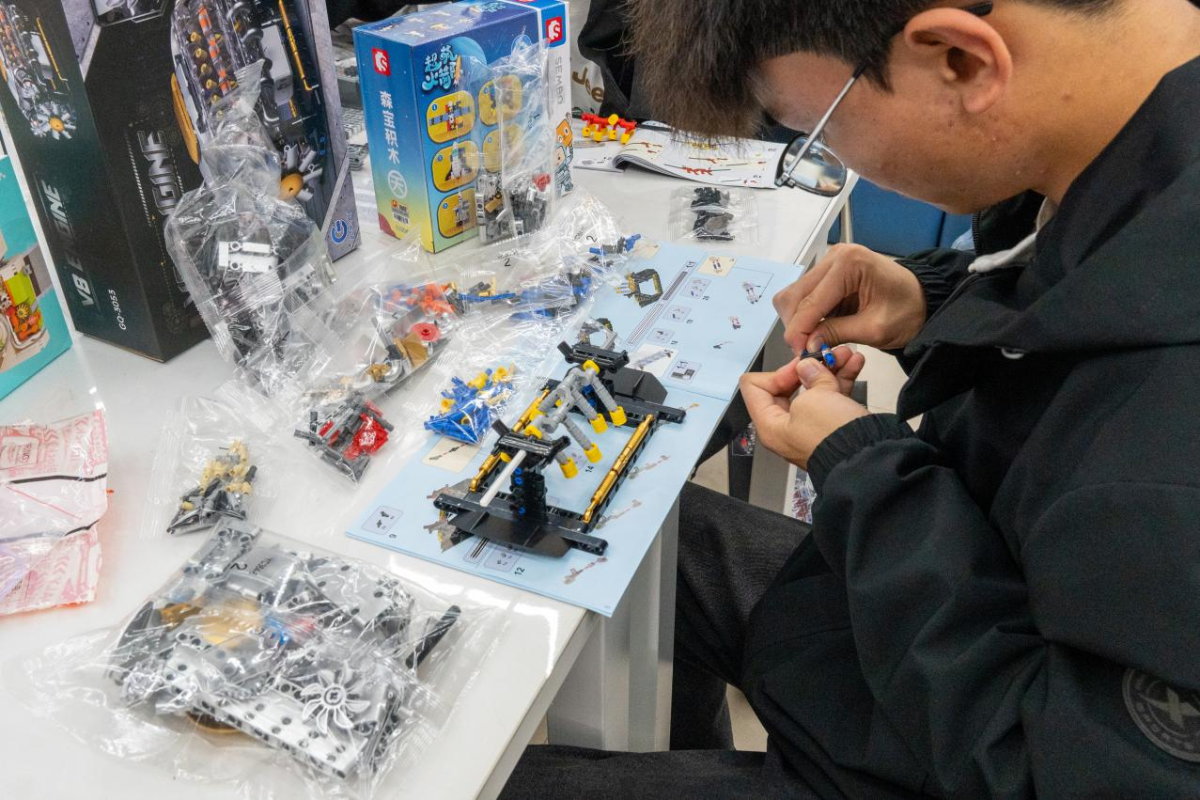 从一堆零散积木到一件件成型作品,活动现场的氛围也悄然转变——最初的轻声探讨,渐渐化作作品完成后的欢呼与分享。“把零散的零件一步步拼成完整的作品,感觉心里的‘乱线团’也跟着被理顺了,特别有成就感。”不少参与活动的同学由衷感慨。现场,同学们纷纷举着自己的“专属成果”拍照留念,灿烂的笑容里,满是卸下压力后的轻松惬意与收获成长的真挚喜悦。