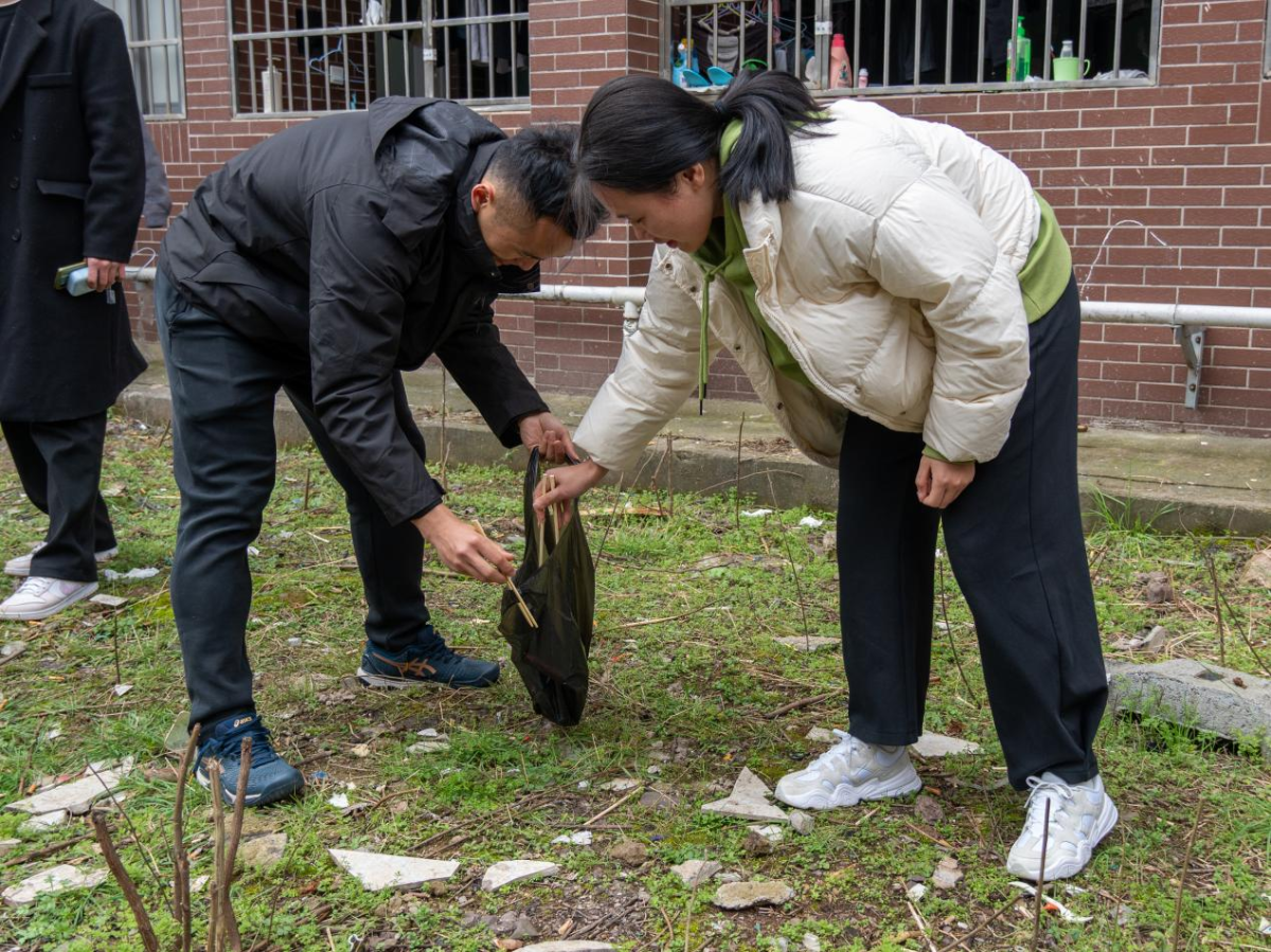 活动中,志愿者针对尚勤苑后坪公共区域长期积存的卫生死角展开全面清理。党员师生冲锋在前,带领团员青年手持扫帚、铁钳、一次性筷子等工具,细致清扫地面垃圾。面对沉积的垃圾,志愿者们相互配合,展现了不怕脏、不怕累的奉献精神。经过一个多小时的集中行动,共清理垃圾100余袋,尚勤苑周边环境焕然一新。