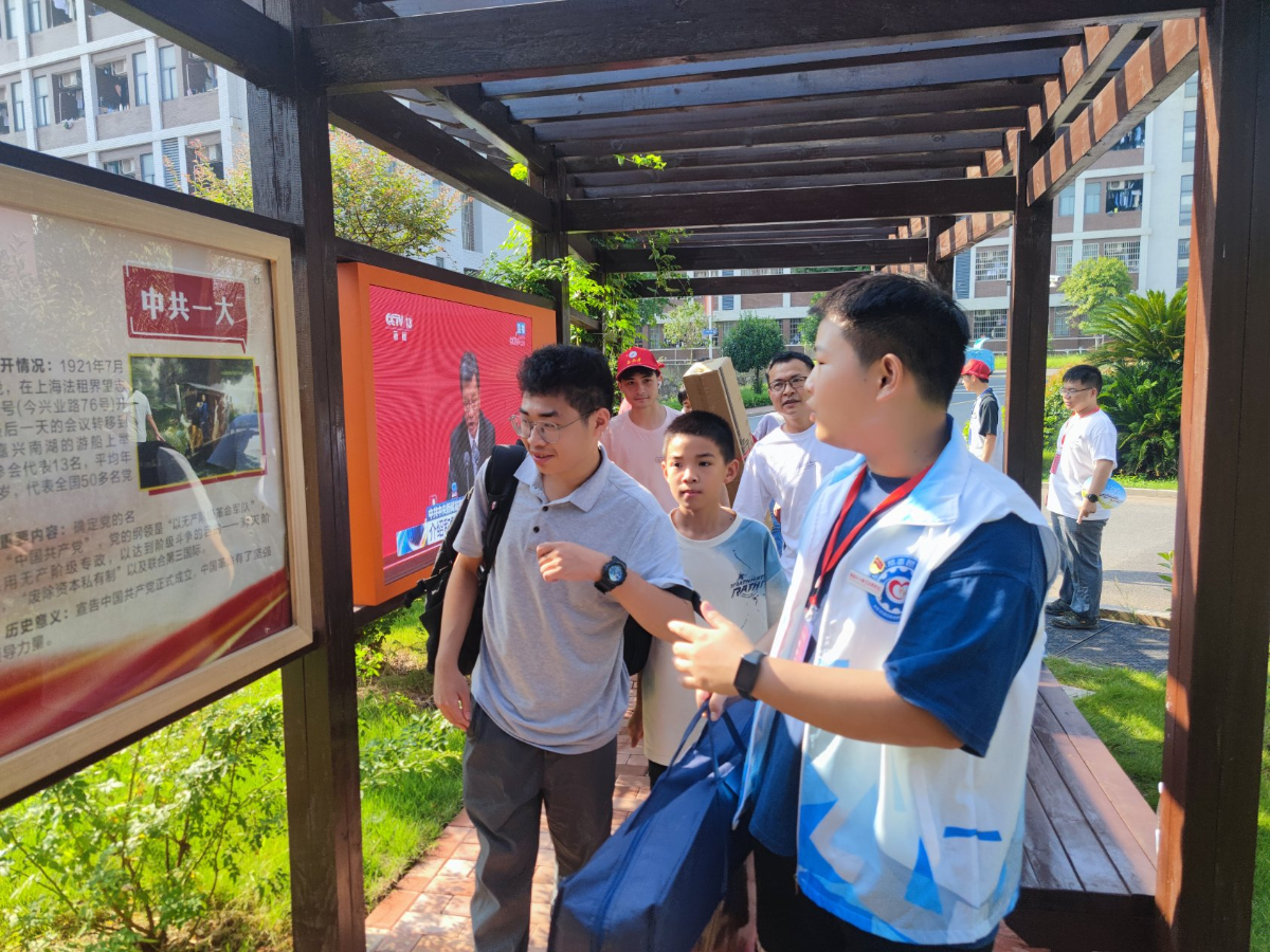 以史明志,启智润心。在党建文化园内,党员志愿者热情地为新生及家长讲解党的历届全国代表大会,从中共一大到二十大,在述往思来中感悟信仰的力量,激励新生扛起时代责任和历史使命,立志将所学用于实践,用新的奋斗创造新的伟业。
