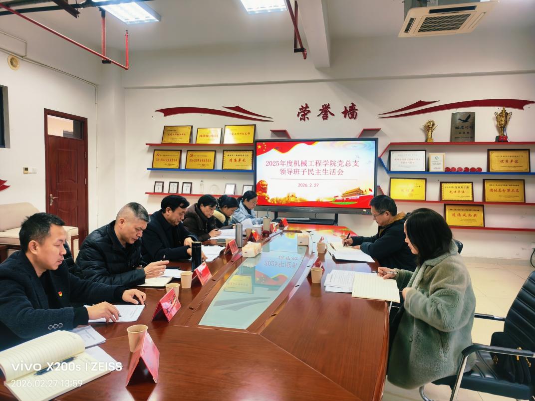 2026年2月27日,机械工程学院党总支在笃学楼317召开2025年度民主生活会。学校民主生活会第十二指导组领导尹爱民、欧阳翊到会指导,学院党总支书记谭件国主持会议,学院班子成员、党员中层干部参加会议。