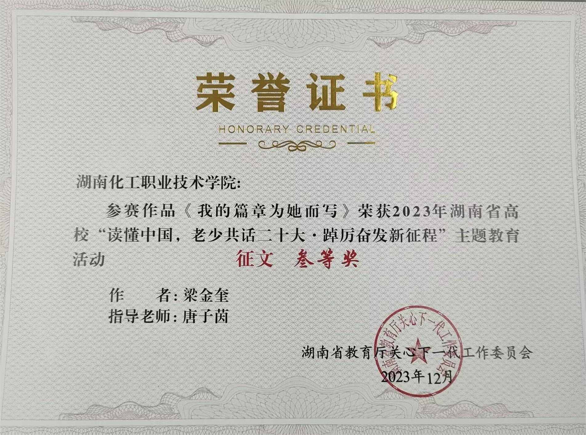日前,中共湖南省委教育工委下发了《关于 2023 年全省普通高校“读懂中国” 主题教育活动作品评选结果的通报》。我校由陈土军老师指导,学生龙家乐、刘丽霞的作品《读懂五老精神》和唐子茵老师指导,学生梁金奎的作品《我的篇章为她而写》获得征文类三等奖。