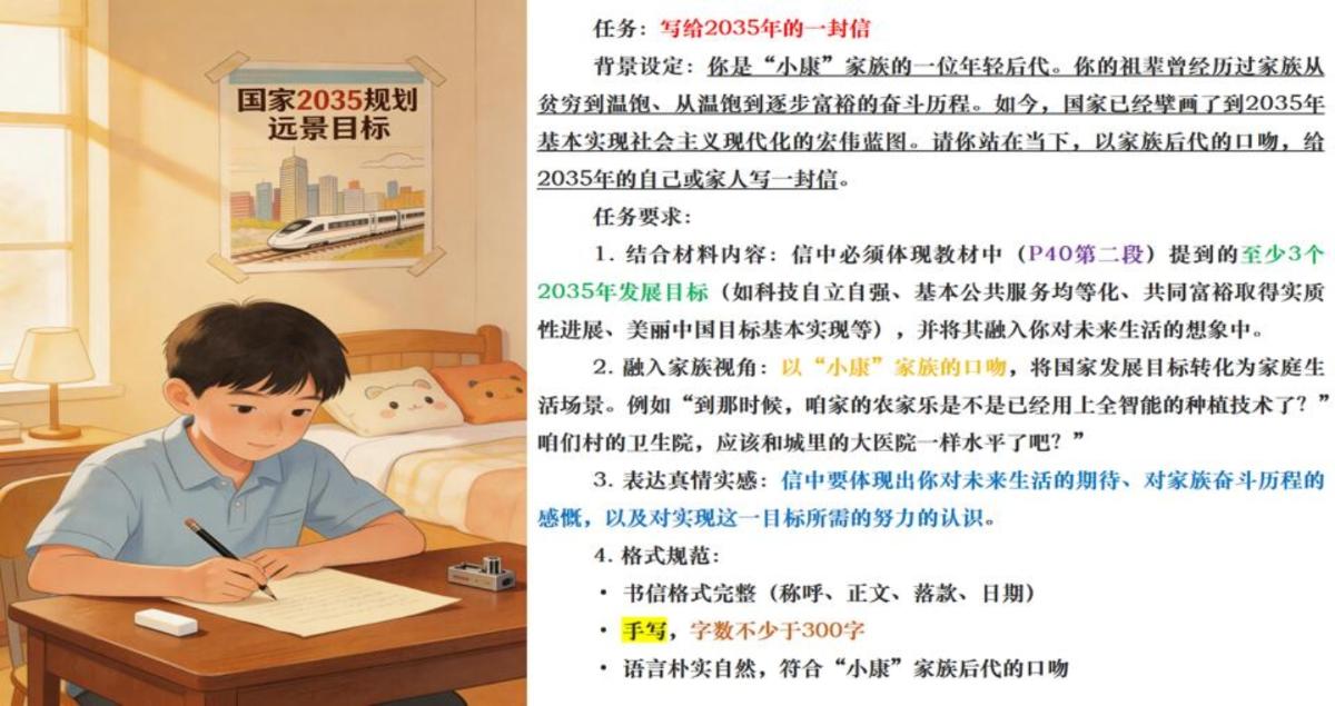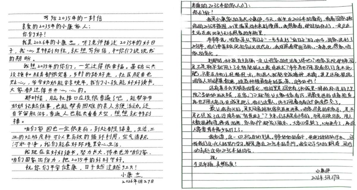 近日,我校马克思主义学院在《习近平新时代中国特色社会主义思想概论》课上开展的教学活动——“写给2035年的一封信”在师生中引发热烈反响。学生以“小康家族后代”的口吻,将国家发展蓝图转化为家庭生活愿景,用朴实的语言畅想2035年基本实现社会主义现代化时的家国模样。课堂作业被学生自发分享后,好评如潮,成为学校思政课“入脑入心”的生动注脚。