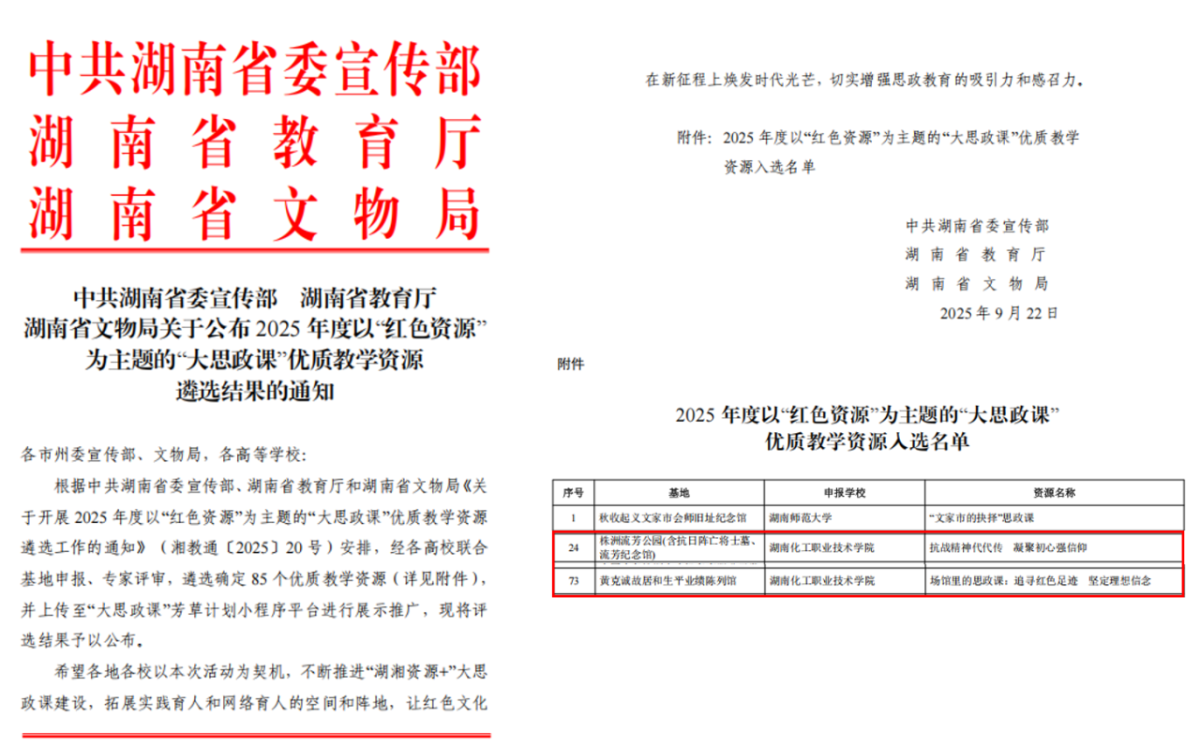 近日,省委宣传部、省教育厅、省文物局正式公布2025年度“大思政课”优质教学资源遴选结果,我校马克思主义学院表现亮眼,2项优质教学资源成功入选,分别是“株洲流芳公园(株洲市烈士纪念园)大思政课教学资源”与“黄克诚故居大思政课资源”,充分彰显了学院在红色资源挖掘与思政教学融合领域的扎实实力。