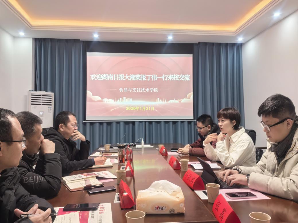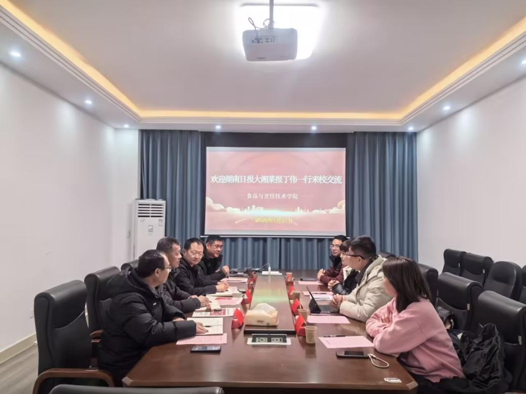 1月21日,湖南日报报业集团《大湘菜报》班子成员(主持工作)、湖南湘菜文化发展有限公司总经理丁伟一行到访我校食品与烹饪技术学院,宾主双方围绕“健康湘菜创新发展”主题开展了深度交流。