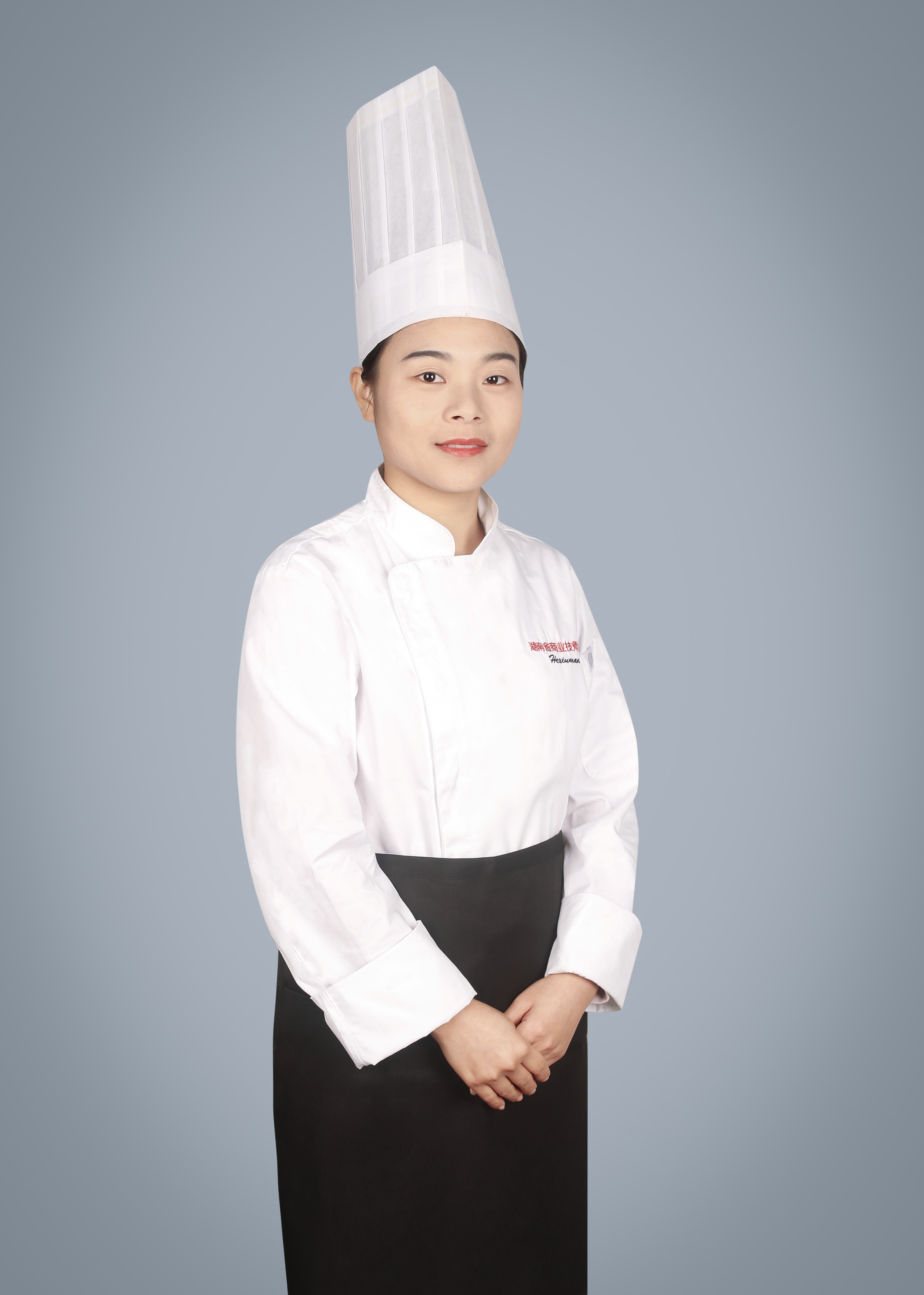 何秀满,中式面点高级技师,“注册中国烹饪名师”“湘点名师”,参加各级各类竞赛获省级一等奖1个、二等奖4个,主持省级课题1项。擅长慕斯蛋糕、面包、翻糖、裱花蛋糕及法式甜点制作。