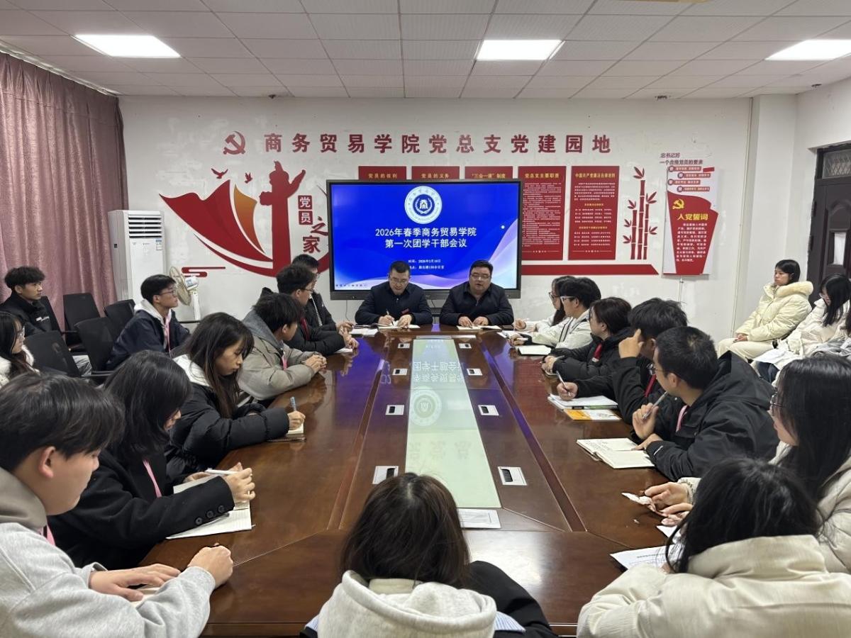 3月10日中午,商务贸易学院在励志楼136会议室召开2026年春季第一次团学干部会议。学院党总支书记杨孝辉、党总支副书记温拥军、团总支书记刘同亚及全体团学会干部参会。