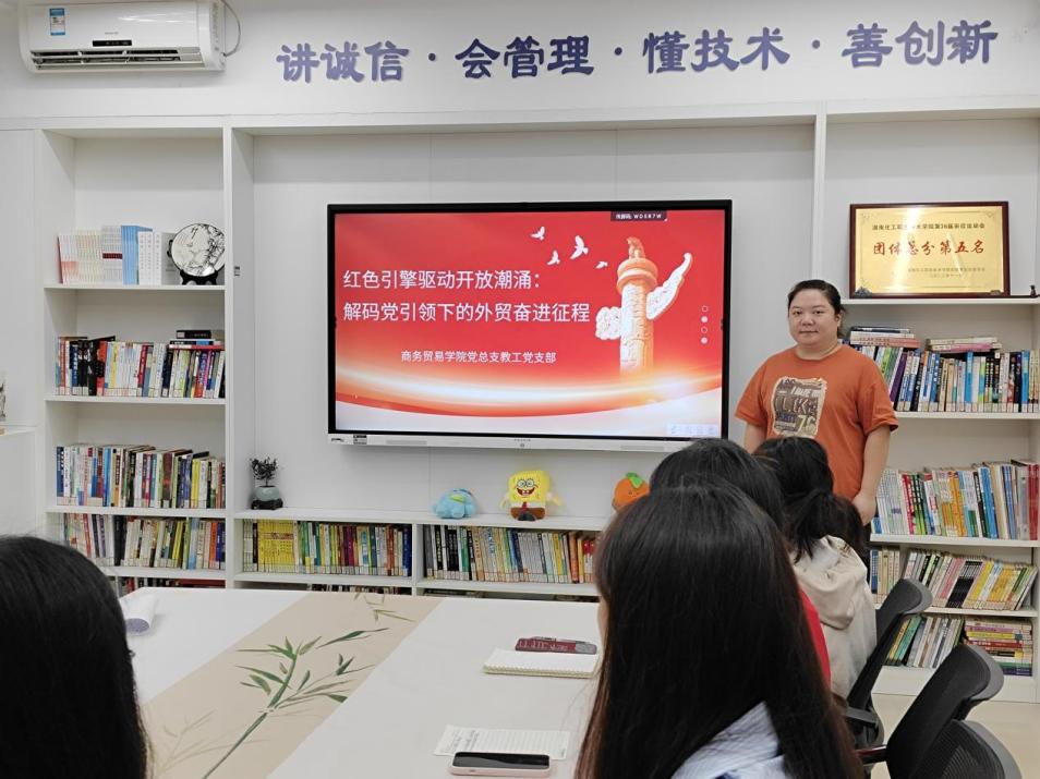 为进一步深化党史学习教育与专业教育融合,推动党建引领与学科发展同频共振,9月 23日下午,商务贸易学院党总支教工党支部在唯真苑一站式社区成功举办“映‘商’红育人坊”主题活动。本期以“红色引擎驱动开放潮涌:解码党引领下的外贸奋进征程”为主题,由支部党员张渺岚主讲,带领学院入党积极分子系统回顾了在中国共产党的坚强领导下,中国外贸从艰难起步到迈向高质量发展的辉煌历程。