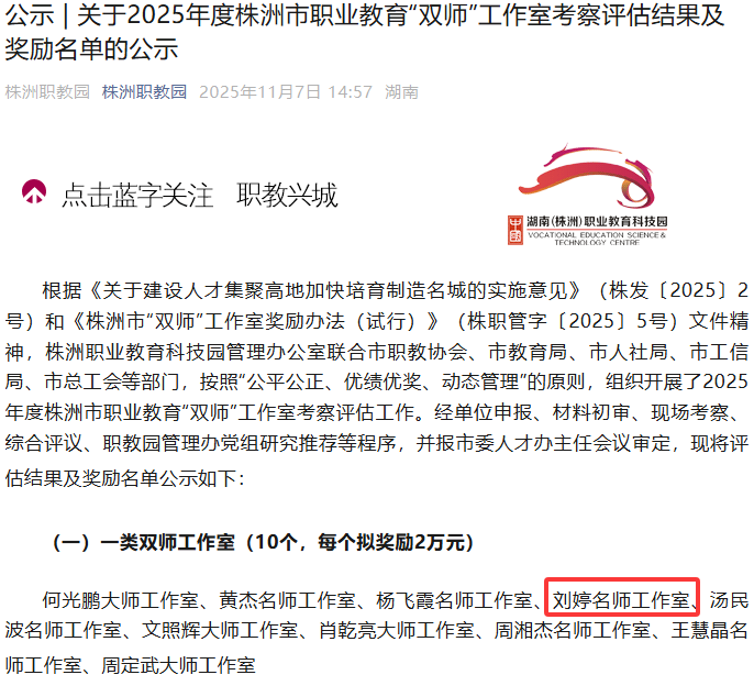 近日,我校商务贸易学院刘婷名师工作室在97个参评工作室中脱颖而出,被认定为“株洲市一类名师工作室”。这一荣誉的获得,既是对工作室建设成效的充分肯定,也是学校高度重视师资队伍建设和人才培养工作的生动体现。