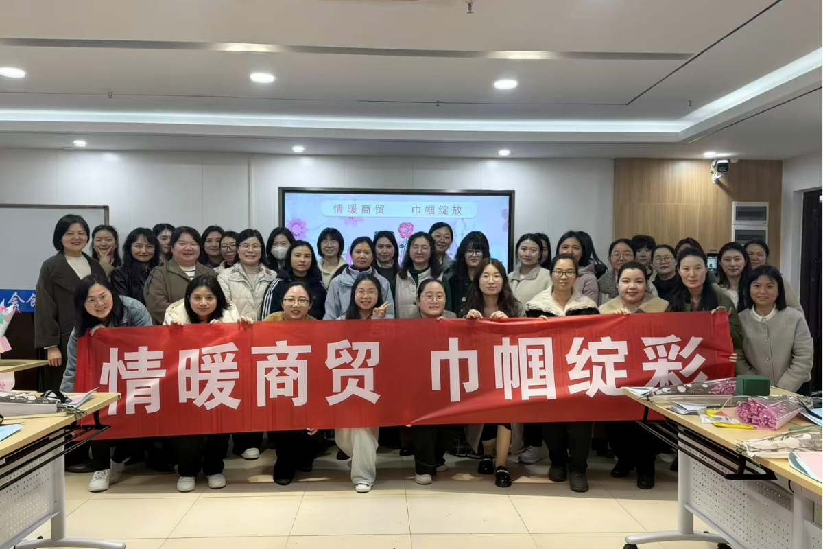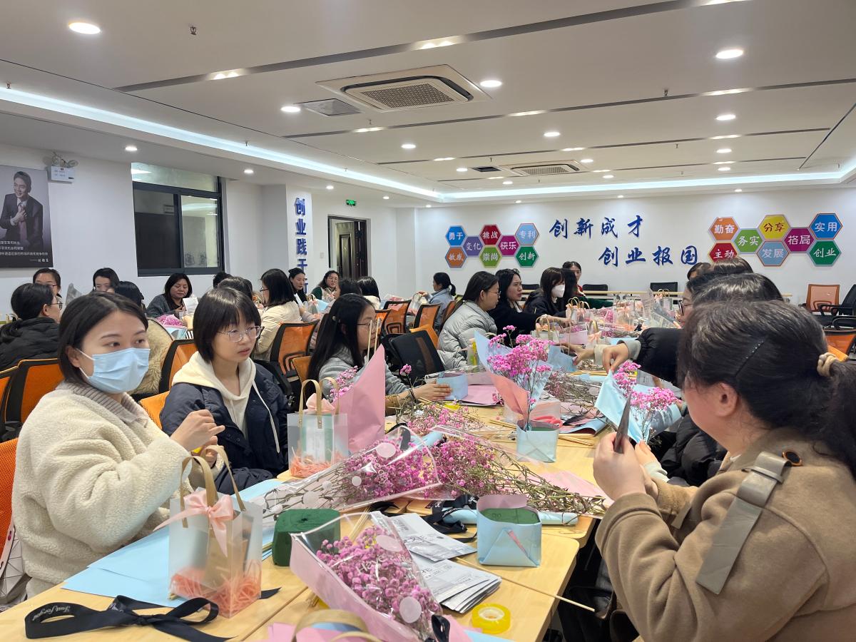 3 月 24日下午,商务贸易学院分工会在就业与创新创业指导中心路演室举办“情暖商贸,巾帼绽彩”女教职工主题活动,活动以创意面膜花 DIY 为主线,致敬巾帼力量,传递节日温情。
