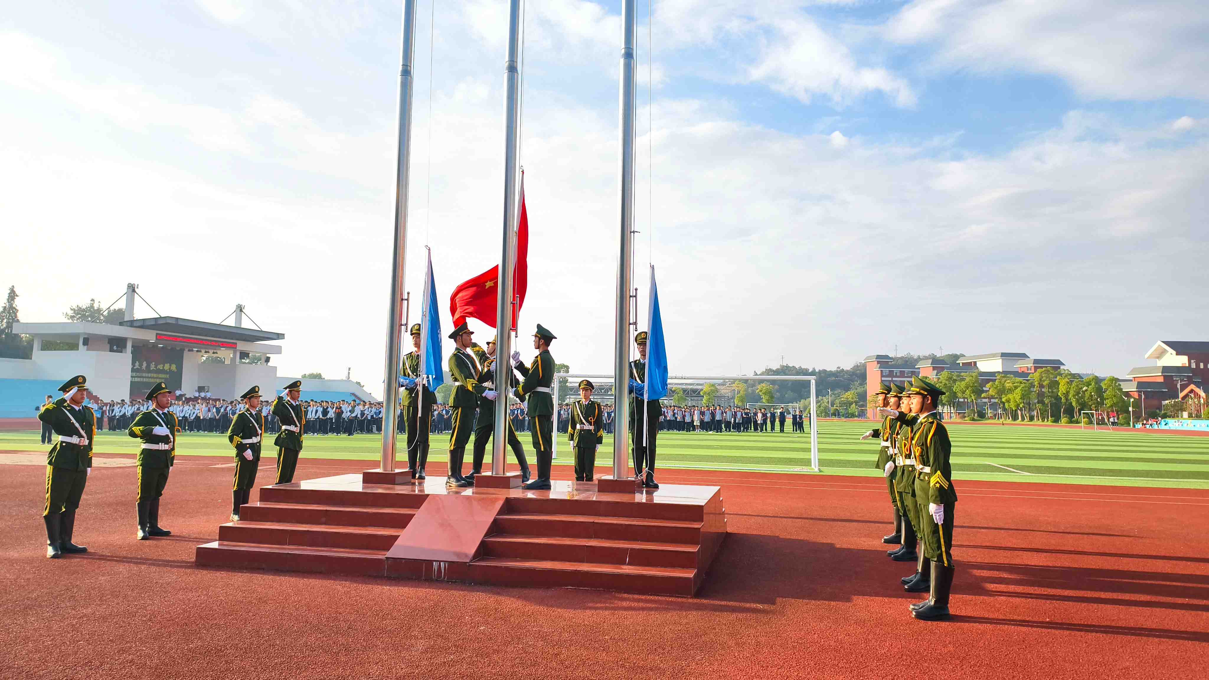 随着国旗和校旗的冉冉升起,全体人员肃立,嘹亮旋律里尽显师生们的昂扬风貌。