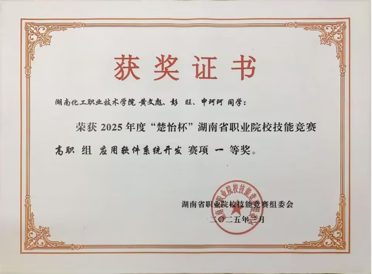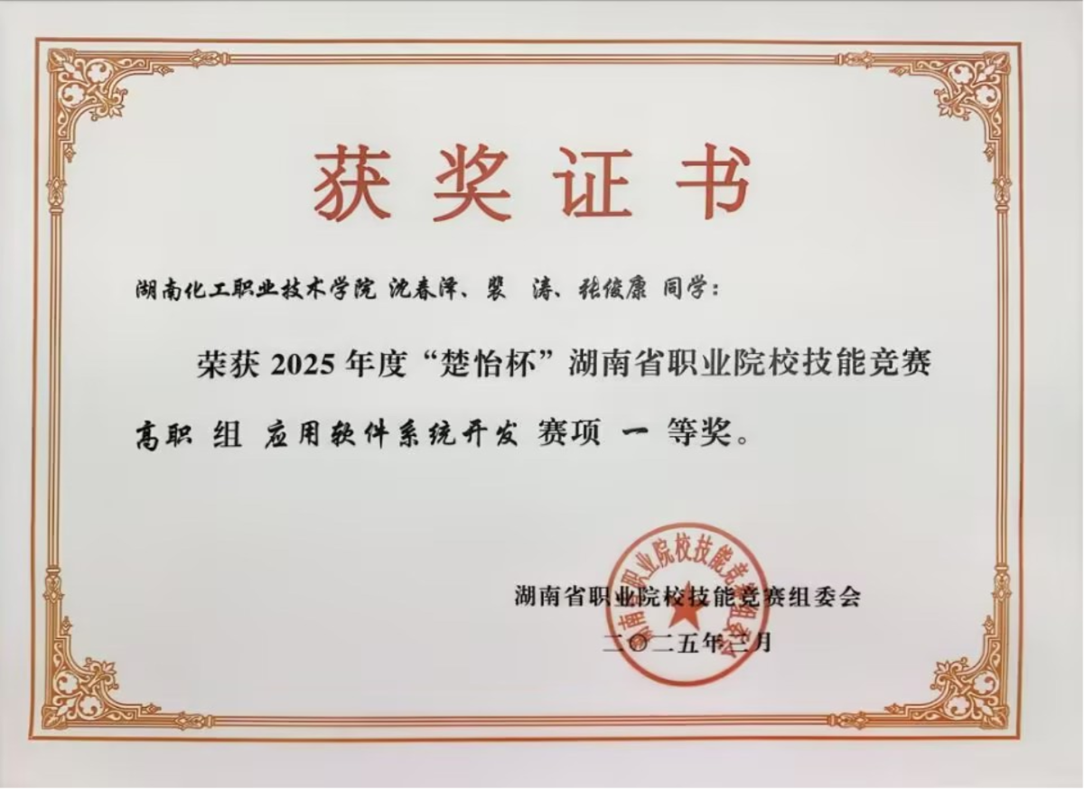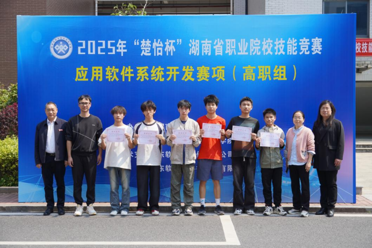 近日,2025年度“楚怡杯”湖南省职业院校技能竞赛“应用软件系统开发”赛项落下帷幕,来自全省46所院校90支队伍共270名学生参赛。经过激烈角逐,现代信息工程学院呙中美、黄银秀指导的2022级软件技术黄文彪、彭旺、申珂珂团队,唐喻理、侯小毛指导的2023级软件技术裴涛、沈春泽、张俊康团队双双荣获一等奖。