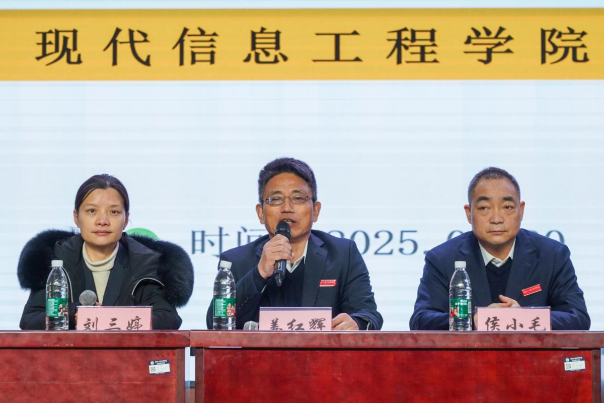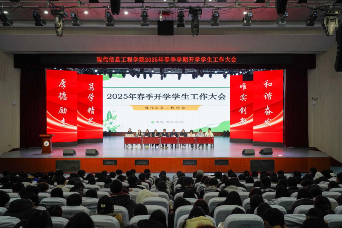 新学期,新气象。2月20日晚,现代信息工程学院在学校大礼堂召开了2025年春季开学学生工作大会。学院党总支书记姜红辉、副院长侯小毛、党总支副书记刘三婷、学工党支部书记童双、团总支书记唐子茵,全体专兼职辅导员以及1100余名在校生参加了本次大会。