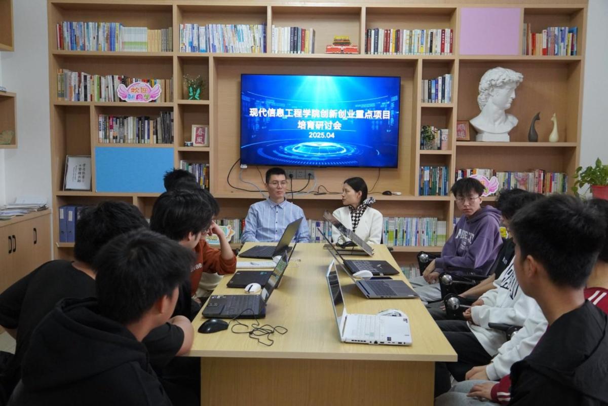 为深入推进创新创业工作,培育高质量双创项目,4月12日,现代信息工程学院在尚思苑一站式学生社区举行2025年度创新创业重点项目研讨会。校学工部部长陈宇应邀到会指导,学院党总支书记姜红辉、副书记刘三婷、各重点项目团队师生代表参会。会议由刘三婷主持。