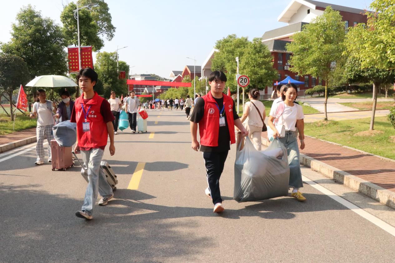 开学当天,校园内彩旗飘扬,浓郁的迎新氛围扑面而来。学院精心设置了迎新接待点,从校门口到报到处,各班班主任和志愿者们全程引导、贴心服务。他们忙碌的身影成为校园里最温暖的风景线。