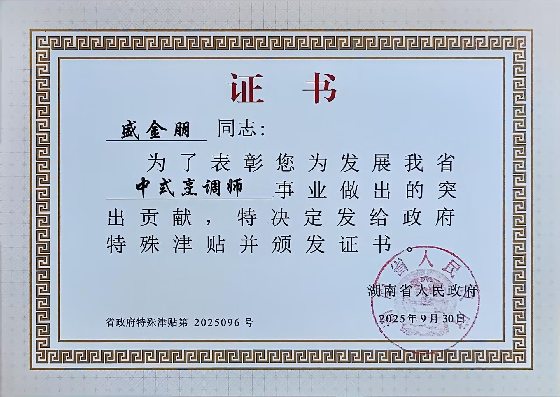 近日,我校领取了享受第七届湖南省政府特殊津贴的两名教师的荣誉证书:一位是深耕职业教育前沿的专业技术人员代表隆平同志(全省总计80名),另一位是传承创新湘菜技艺的高技能人才代表盛金朋同志(全省总计20名)。他们的入选,充分彰显了我校长期以来坚持人才强校战略,着力打造高素质专业化教师队伍、培养高技术高技能人才、积极服务我省“三高四新”战略定位和使命任务的生动体现。