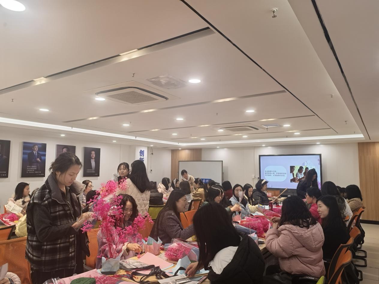 本次活动以“护肤+手工”为亮点,兼具实用性与趣味性。插花和美容导师为女教职工们带来一场干货满满的插花及美容护肤小讲座,用通俗易懂的语言讲解基础花艺搭配技巧与面膜护肤核心知识,针对日常护肤痛点给出实用建议,让在场教职工们收获颇丰。随后的面膜花DIY环节中,老师们兴致高昂、各展创意,在动手创作中交流心得、释放压力,打造专属自己的面膜花束,现场欢声笑语不断,暖意融融。活动最后,全体女教职工手持作品合影留念,定格温馨瞬间。