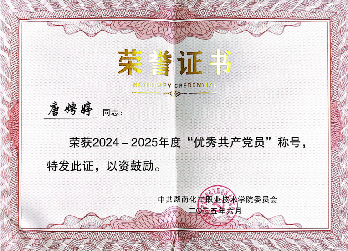唐娉婷,中共党员,硕士,高级工程师,湖南化工职业技术学院智能控制工程学院教学干事,荣获湖南化工职业技术学院2023年度工会积极分子、2024年度优秀工会干部、2025年度优秀共产党员。