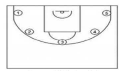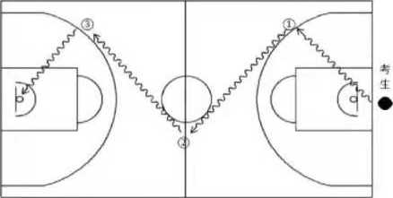 3名队员一组完成连续的3组折回跑1次,每组从底线出发遇到两个罚球线,中线和对面底线折回(脚踩线)。