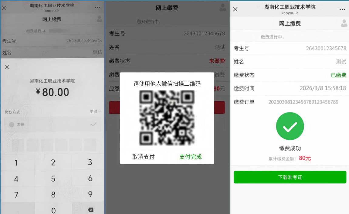 在网上缴费确认交易时,应查看收款方是否为“湖南化工职业技术学院”,如果不是,请立即停止付款,并电话告知我院。
