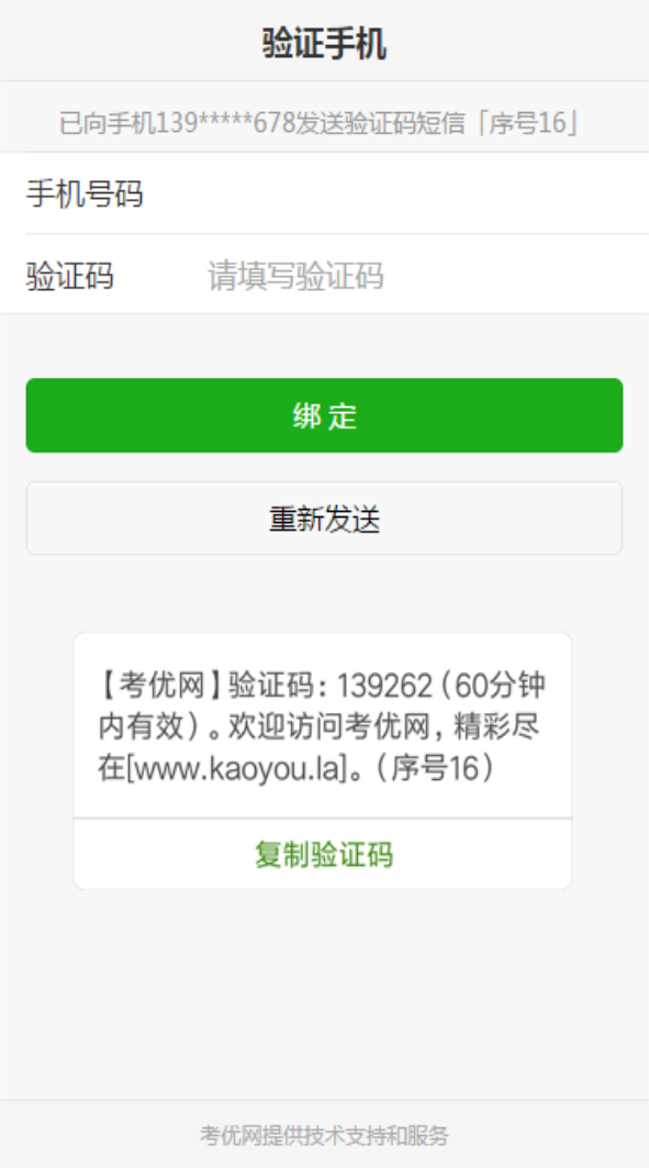 为便于联系考生,缴费前需验证考生联系电话的有效性。系统向考生手机发送随机验证码短信,考生收到验证码短信后,填写收到的验证码完成验证。