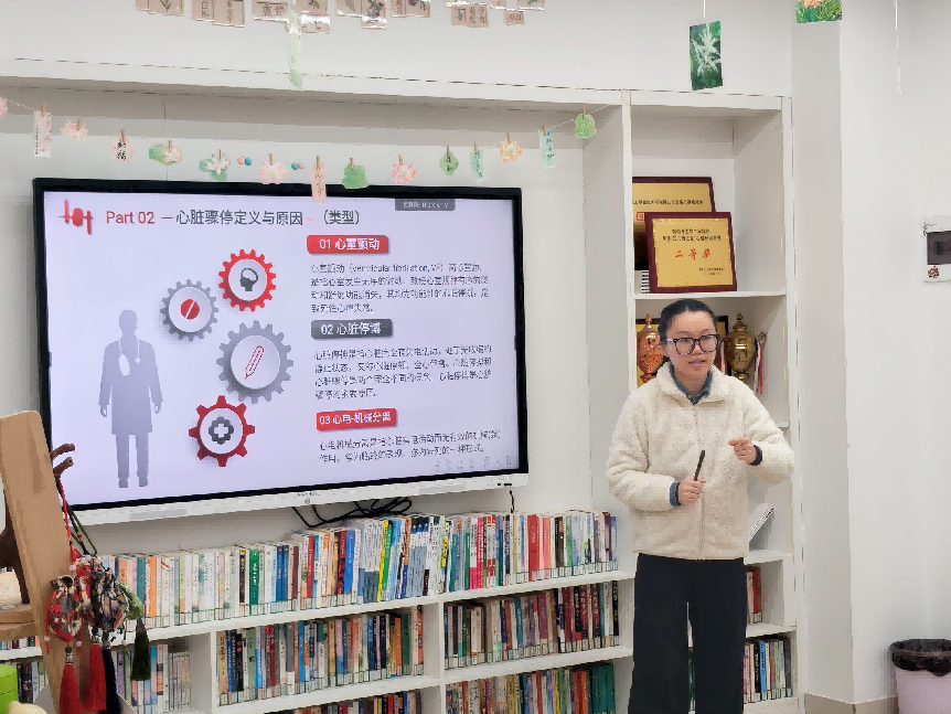 曾晶围绕“急救技能培训”进行现场指导学生进行心肺复苏等实操训练,强化应急反应与救护能力培训内容涵盖了心肺复苏、外伤处理、人工呼吸等实用技能。通过理论讲解和实际操作相结合的方式,确保每位同学都能掌握正确的应急救护方法。